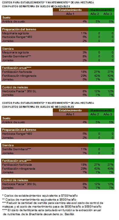 Se calcula que La información sobre pastos mejorados es muy amplia y que respaldada en múltiples trabajos de investigación científica nos presentan una gama muy amplia de datos que sugieren mejoras en la producción y manejo. Estos datos hacen referencia por ejemplo a costos de establecimiento y mantenimiento. En el caso de pastos mejorados para zonas tropicales estos se distribuyen de la siguiente forma: