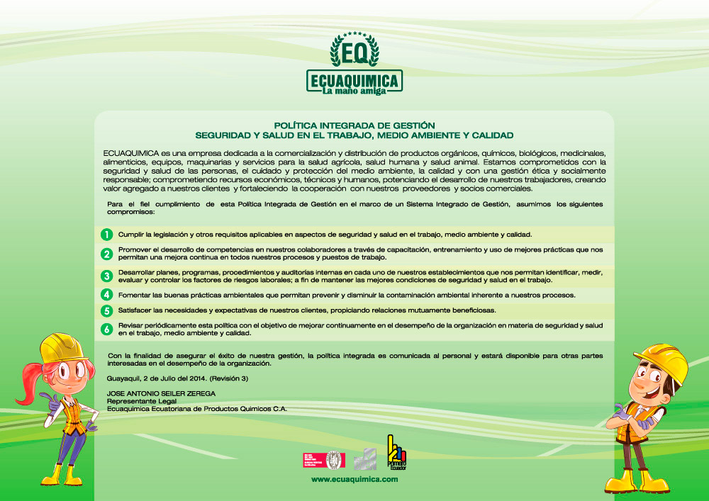 ECUAQUIMICA cuenta con un Sistema Integrado de Gestión (SIG) que cubre todos los aspectos de la organización, desde el aseguramiento de la calidad del producto e incremento de la satisfacción del cliente hasta la realización y mantenimiento de las operaciones dentro de una situación de prevención de la contaminación ambiental y de los riesgos de seguridad y salud ocupacional.